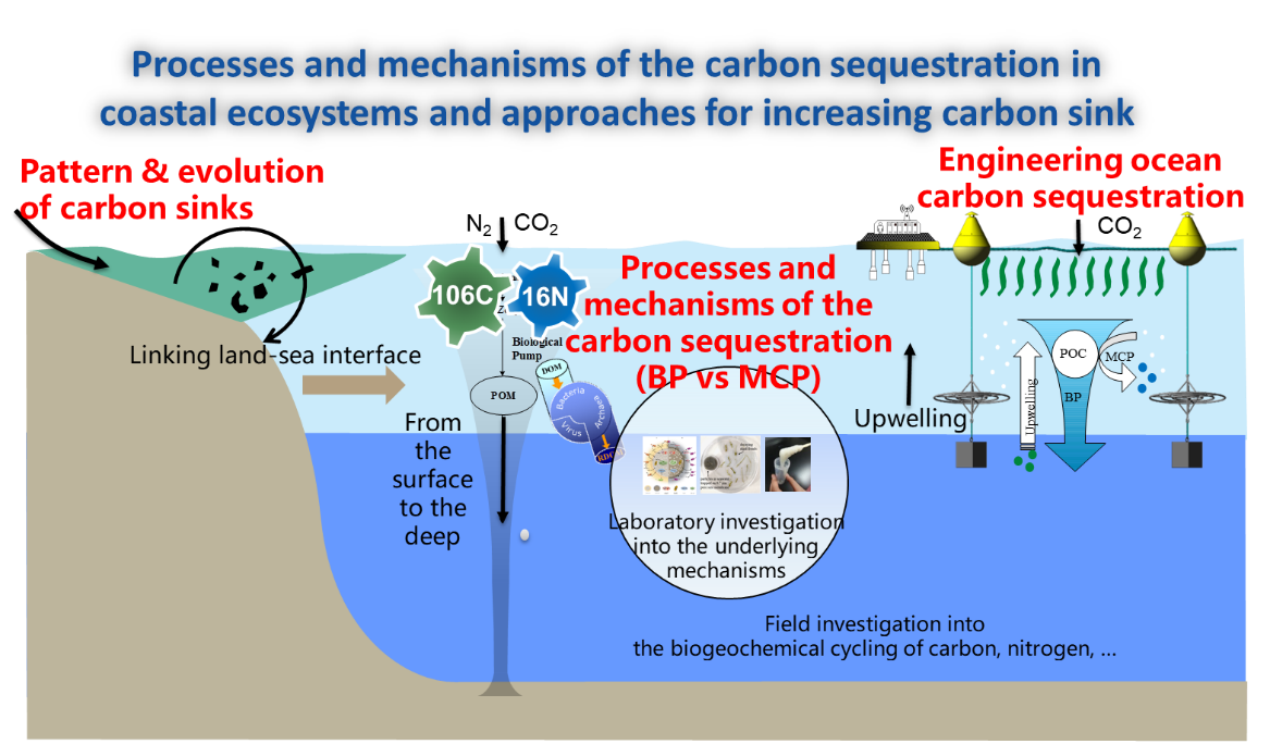 Ocean is the largest carbon pool on earth, serving as the buffer of global climate change, absorbing about 1/3 of CO2 produced by human activities. Carbon sink captured by marine ecosystem is called the "Blue Carbon Sink" (hereinafter referred to as "blue carbon"), which is one of the most important mechanisms for the sea to store carbon. The initial form of blue carbon is visible plant carbon sequestration in the coastal zone. As a matter of fact, the invisible microorganisms (phytoplankton, bacteria, archaea, and protozoa), which have always been ignored, account for 90% of the marine biomass and constitute the main component of blue carbon. The marginal sea covers one third of the total territory of China, and it is of urgent need to explore the immense potential of carbon sinks. This project is comprised of four subprojects, aiming at the key processes and mechanisms of the carbon sequestration in coastal ecosystems and ways to increase ocean carbon sink. The project has made outstanding achievements in terms of community structure and ecosystem function in the carbon cycle, physiological and molecular mechanisms of refractory dissolved organic carbon production, re-establishment of the evolution process of ocean carbon sequestration in geologic history by sedimentary records, carbon sink dynamics in global warming scenario models, and theoretical and technical foundations for engineering ocean carbon sequestration. These outputs contribute to the sustainable development of the marine ecosystem and the national carbon neutrality target.
