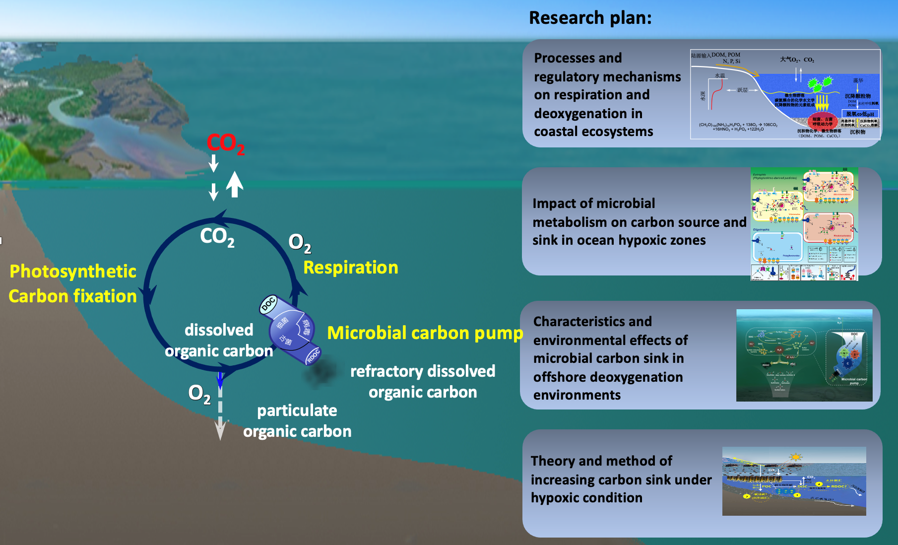 This project focuses on the mechanisms driving coastal deoxygenation by microbes and their effects on carbon sinks under the multiple stresses of natural change and human disturbance. This project explores the Yangtze estuary, the Bohai Sea and the Yellow Sea, by ship-based observation, field and manipulative experiments, to analyze the processes and mechanisms of coastal deoxygenation from the perspective of microbial control of the marine carbon cycle, to illustrates the impact of marine deoxygenation on carbon sinks through the coupling of carbon, nitrogen and sulfur cycles studies, and to explore the theories and methods for increasing carbon sinks in the deoxygenated environments based on the processes of microbial carbon sequestration and macro-algae carbon fixation. This project will provide insights for the causes of the occurrence and development of coastal deoxygenation, and establish scientific basis and technical support for increasing carbon sink.