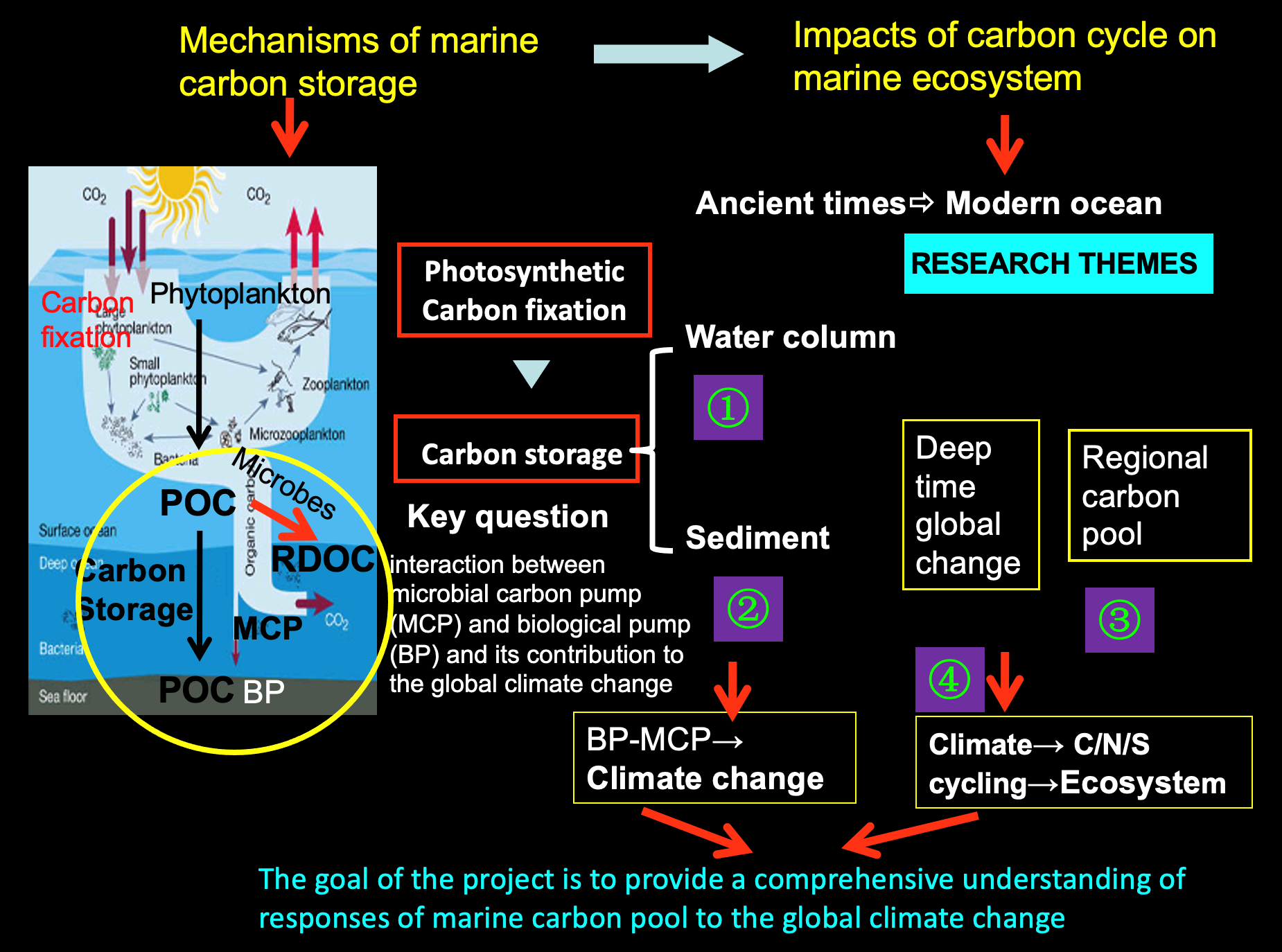 Marine carbon cycle is in responses to global climate change and anthropogenic activities, and throws significant impact on ecosystems. However, it remains unclear concerning the sensitivity of marine biogeochemical cycles to the climate change and the key processes to impact long-term marine ecosystems. By focusing on the interaction of microbial carbon pump and biological pump, the coupling of carbon, nitrogen and sulphur cycles, and the integration and comparison of modern days with critical periods of Earth history, the project aims to decipher the mechanisms of marine carbon storage, biogeochemical processes in response to climate change and anthropogenic activities, and their impacts on ecosystems. Four research themes conducted in South China Sea, Bohai Sea and Yellow sea in China will include the interaction between microbial carbon pump (MCP) and biological pump (BP), elemental biogeochemical cycles across sediment-water interface and its contribution to carbon storage, variation of regional carbon pool in response to global climate change and anthropogenic activities, coupled carbon, nitrogen and sulphur cycles in response to deep time global change and their impact on marine ecosystems. This research tries to fill the critical gap between short-term processes in modern oceans and the long-term effects in ancient times. The goal of the project is to provide a comprehensive understanding of responses of marine carbon pool to the global climate change on multiple spatiotemporal scales, and to identify the naturally or anthropogenically-driving ocean acidification processes, key processes of carbon storage, and their impact on marine ecosystems. In this project, four themes include 1) interaction between MCP and BP and its contribution to marine carbon storage. 2) effect of carbon, nitrogen and sulphur cycles across sediment-water interface and its contribution to marine carbon storage. 3) regional carbon pool in response to global change in modern days. 4) coupled carbon, nitrogen and sulphur cycles in response to deep time global change.