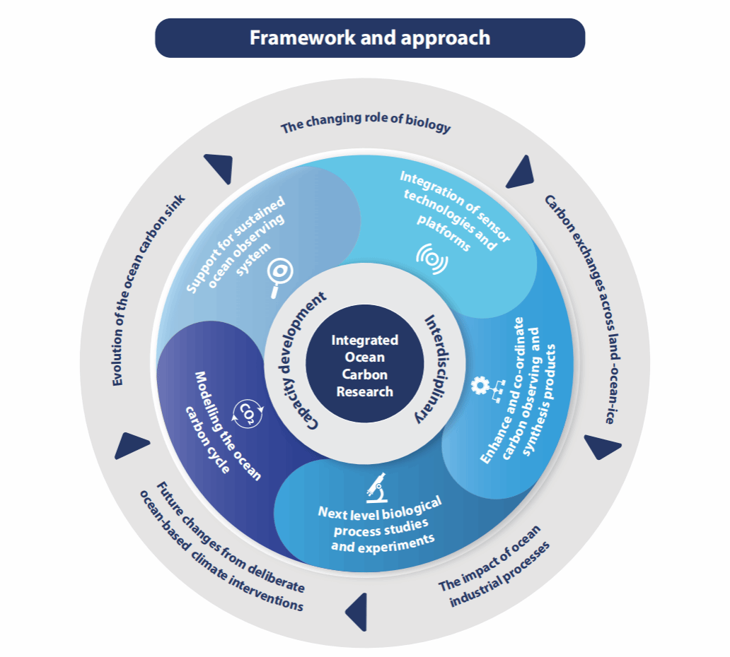 Figure. Overview of the five identified focus areas for integrated ocean carbon research, prioritised approaches and a framework of interdisciplinarity and capacity development.